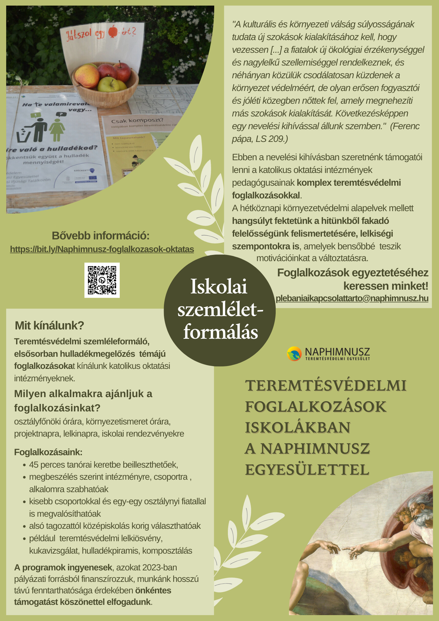 Ebben a nevelési kihívásban szeretnénk segítséget nyújtani (elsősorban) katolikus oktatási intézmények közösségeinek. Ingyenes szemléletformáló foglalkozásaink során a komplex, a környezeti problémákra, azok okaira és következményeire, az egyéni valamint a közösségi megoldási és cselekvési lehetőségekre szeretnénk segíteni ráirányítani a fiatalok figyelmét. Gondolatébresztő, reflektív, tettekre inspiráló módon szeretnénk megmutatni, hogy a „…dolgokon lehet változtatni” (LS 13.)