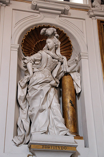 A lelki erősség szimbolikus nőalakját sisakban és vértben ábrázolják. Mert „a test gyönge”, akaraterőnk gyakran kevésnek bizonyul. Az lehet csak eredményes sportoló, aki akar és tud is naponta nekilátni a feladatnak, erőfeszítésnek. Nincs aranyérem – képletesen értve sem –, veríték nélkül, és ebben a küzdelemben a lelki erősség az edzőnk.