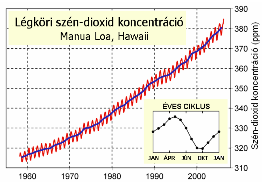 Az ábra azonban másra is rámutat: minden ősz végén kicsivel több szén-dioxid marad a légkörben, mint amennyi előtte volt. Charles Keeling úgy vélte, hogy ez a folytonos emelkedés egyértelműen a fosszilis tüzelőanyagok elégetésének a következménye, tehát jelentős részben emberi tevékenység idézi elő a légkörbe kerülő üvegházhatású gázok okozta globális felmelegedést. Különös, hogy a fák erre a szén-dioxid-többletre erőteljesebb növekedéssel reagálnak. Talán így próbálkoznak a bioszféra kívánatos egyensúlyának helyreállításával?