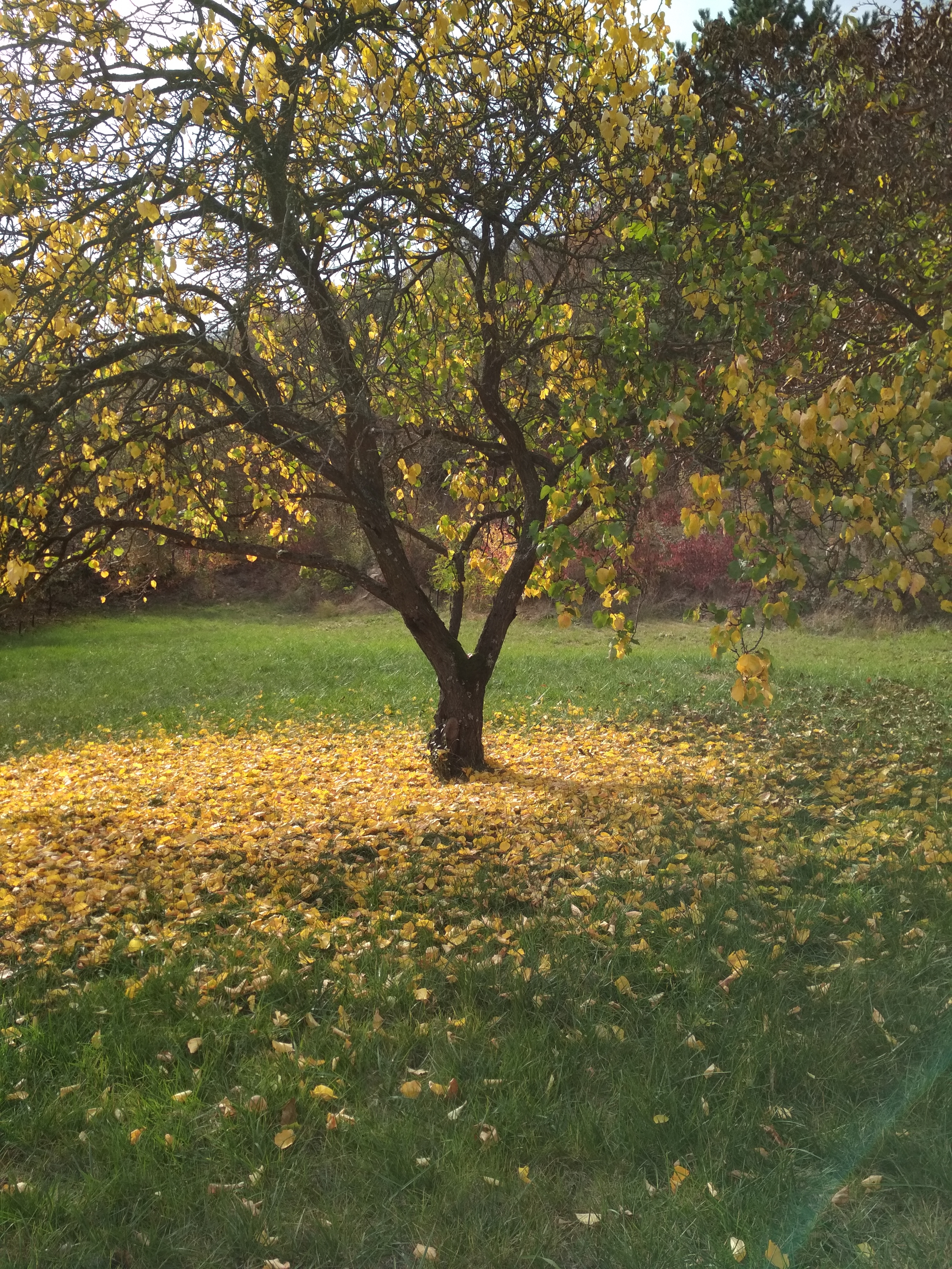 Csodálatos látvány egy idős gyümölcsfa lombhullás idején is. A sárgabarackfa pedig különösen szép. Ha csak az aranyló avartakarót tekintjük is, gondoljuk el, mennyi szén-dioxidot kötött meg a levegőből, mennyi szerves anyagot alkotott a levelek műhelyében az idén is ez a fa. Az ágak, a gyökerek is vastagodtak, élő szénraktárak a fás részek. És ezek még csak a klímavédelmi előnyök. Hulladékot nem hagyott maga után, hiszen az avar lassan újra humusszá bomlik, táplálva apró talajlakó organizmusok milliárdjait. Ami a jövendőhöz szükséges, már ott van a rügyekbe rejtve, hogy a következő évben tovább terebélyesedve újra kínáljon virágot, nektárt, érett gyümölcsöt, enyhe árnyékot az arra járóknak, alatta megpihenőknek. Hálával gondolhatunk elődeinkre, akik valamikor elültették, óvták, gondozták csemetekorában.