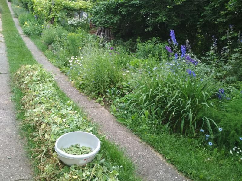 Valóban, a márciusi magvetés óta mennyi várakozással, aggodalommal figyeltük a kis palánták fejlődését! A növénykék rendre megküzdöttek a fagyos éjszakákkal, aztán a száraz, szeles kora tavaszi napokkal, míg végül megérkeztek a langyos májusi esők, ami aztán gyors növekedésre, derűs virágzásra indította őket, míg mostanra, több mint két hónap elteltével a termés megérett. Igen, akár alszik a kertész, akár ébren van, a borsó sorsa valójában nem az ő kezében van… Az idén jókor jött az eső, a kártevők is elmaradtak, és mindig volt annyi szünet a csapadékos napok között, hogy rá lehetett lépni a földre, végigtapogatni a szépen gyarapodó hüvelyeket, hogy melyik érett már a szedésre, és valóban, némelyik tő százszoros, hatvanszoros, harmincszoros termést is hozott.