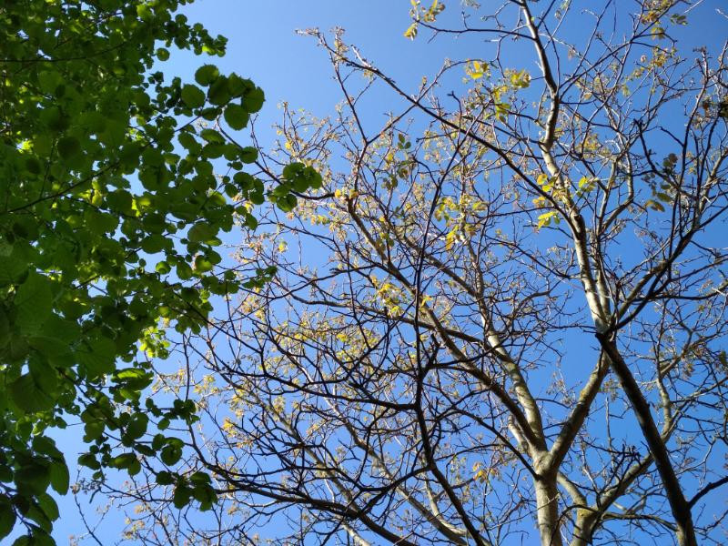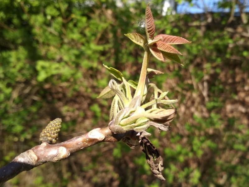 De pár nap múlva, az eddig zárt oldalrügyekből újraindult az élet! Ha nincs a fagy, ezek a rügyek talán örökre álomba merülnek, vagy láthatatlanul egyre mélyebbre süppedve a vázágakba, évek múlva törnek ki hirtelen, egy sérülés vagy még erősebb fagykár hatására. Tökéletesen megformálva, de még kicsit összekuszálódva, sietve bomlanak ki, aztán szépen elrendeződnek, feltérképezik az irányokat, égtájakat, árnyékoló szomszédokat, és kitöltik a teret, hogy minden kis fénysugarat hasznosíthassanak a levelek. Nem véletlen, hogy a diófa ágai ennyire görbén, zegzugos szabálytalanságban növekednek, hiszen négy-öt évenként megismétlődik a tavaszi fagykár. Igaz, az idei veszteség már nem pótolható, de a fa mégis újratervez, lemondva most már a bőséges termésről, az elegáns koronaformáról, tudomásul véve a szomszédok előnyét a fényért való versengésben…