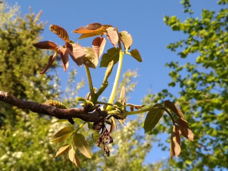 A fény felé törekvő, nagy hittel újra kihajtó diófa most már élvezi a többiek lombozatának védelmét, enyhébb, párásabb éjszakák segítik az új levélkék megerősödését. Milyen különös, ahogy tavasszal a levelek először bíbor árnyalatúak, és csak az aranysárgán át jutnak a valódi zöldig, amikor végre a levelek műhelyében megindulhat a fotoszintézis. Ősszel ez a színváltás majd újra megismétlődik, csak sokkal látványosabban, és persze fordított sorrendben, egészen a rozsdabarnáig sötétedve…