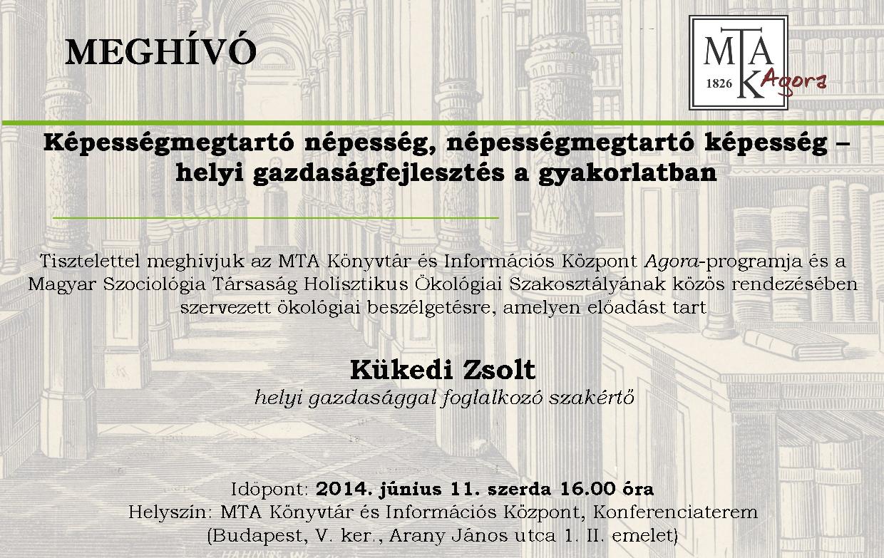 Tisztelettel meghívjuk az MTAKönyvtár és Információs Központ Agora-programja és a Magyar Szociológia Társaság Holisztikus Ökológiai Szakosztályának közös rendezésében szervezett ökológiai beszélgetésre, amelyen előadást tart Kükedi Zsolt, helyi gazdasággal foglalkozó szakértő, a Naphimnusz Természetvédelmi Egyesület tagja.
