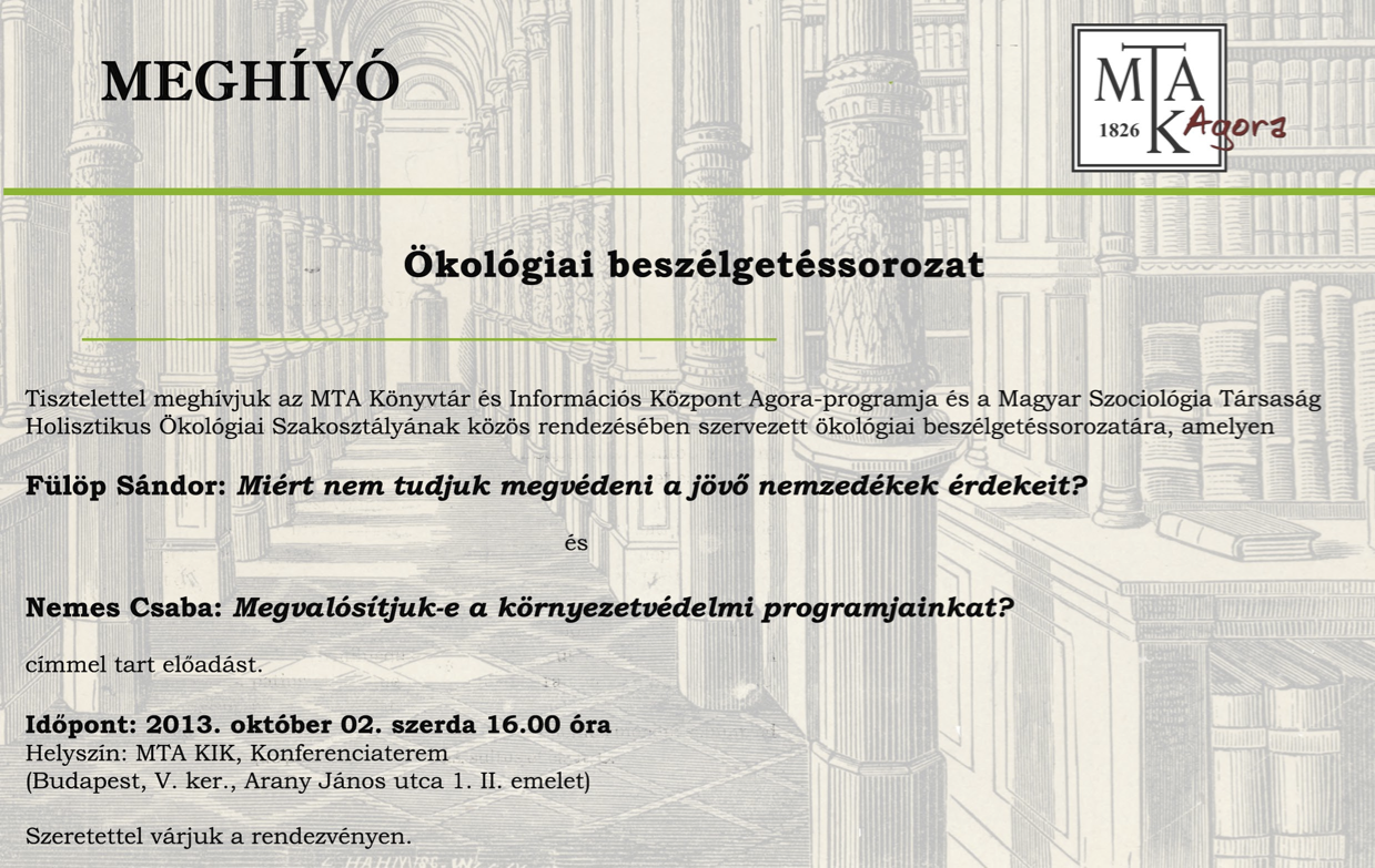Tisztelettel meghívjuk az MTA Könyvtár és Információs Központ Agora-programja és a Magyar Szociológia Társaság Holisztikus Ökológiai Szakosztályának közös rendezésében szervezett ökológiai beszélgetéssorozatára.